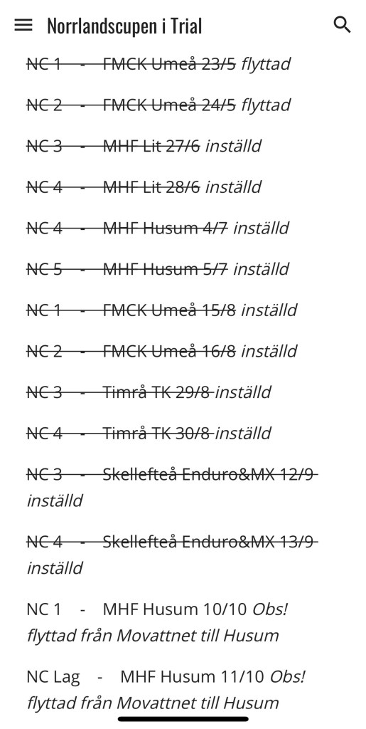 Tyvärr har såväl FMCK Umeå som Skellefteå EMX ställt in sina deltävlingar som ett resultat av att pandemin lett till att årets verksamhet legat på is nästan helt. Som det är just nu så ligger avslutningen i Husum den 10-11/10 kvar och vi hoppas att åtminstone kunna samlas till en helg i Norrland