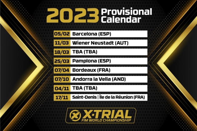2023 FIM X-Trial World Championship öppnar med det berömda X-Trial Barcelona i februari och avslutas med en återkomst till La Réunion i mitten av november. Däremellan kommer mästerskapets promotor Esdeux att ta serien till inte bara sportens hjärtan i Spanien och Frankrike, utan även Österrike och Andorra la Vella.