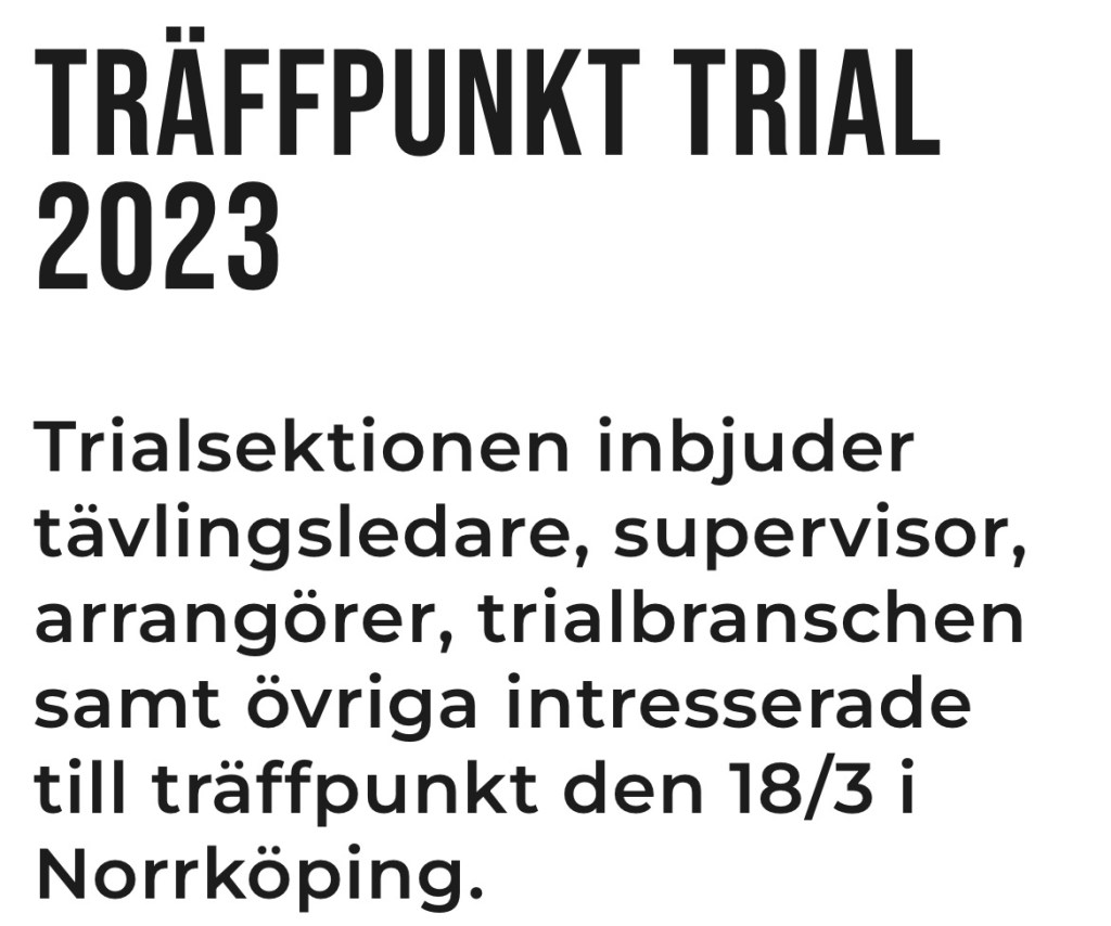 Trialsektionen inbjuder tävlingsledare, supervisor, arrangörer, trialbranschen samt övriga intresserade till Träffpunkt den 18 mars i Norrköping. Kursen räknas som fortbildning för supervisor & tävlingsledare.