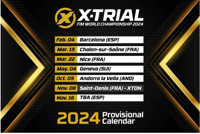 De inledande deltävlingarna tar oss tillbaka till tre städer som dök upp på 2023 års kalender. X-Trial Barcelona behåller sitt traditionella februari datum och kommer att vara säsongens premiär, innan serien beger sig till Frankrike för X-Trial Chalon-sur-Saône och X-Trial Nice. För att fullborda vårens schema beger sig serien sedan till FIM:s hemvist för den fjärde omgången av X-Trial Geneva och den första sedan 2012.
